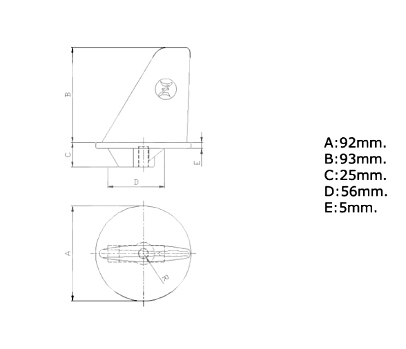 • Dimensiones: A: 92 mm. B: 93 mm. C: 25 mm. D: 56 mm. E: 5 mm   Rosca: 7/16 W   Peso: 0.75 kg